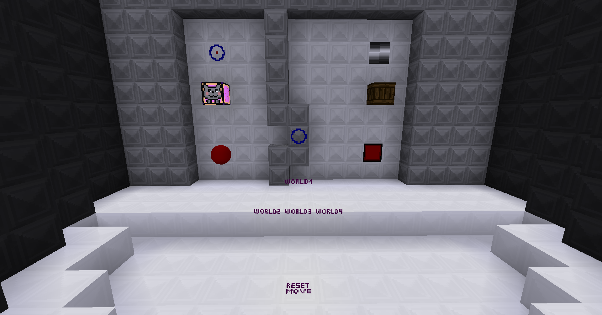 Controls are straight-forward: Movement keys to move, jump key to fire a ball (rarely used), sneak key to reset and Aux1 key to undo last move. Unfortunately, the undo only works for the last move. The level selection is less pleasant: You must punch literally blocks with the word "WORLD1" on them. You must manually select the next level after you completed one. This gets tedious.