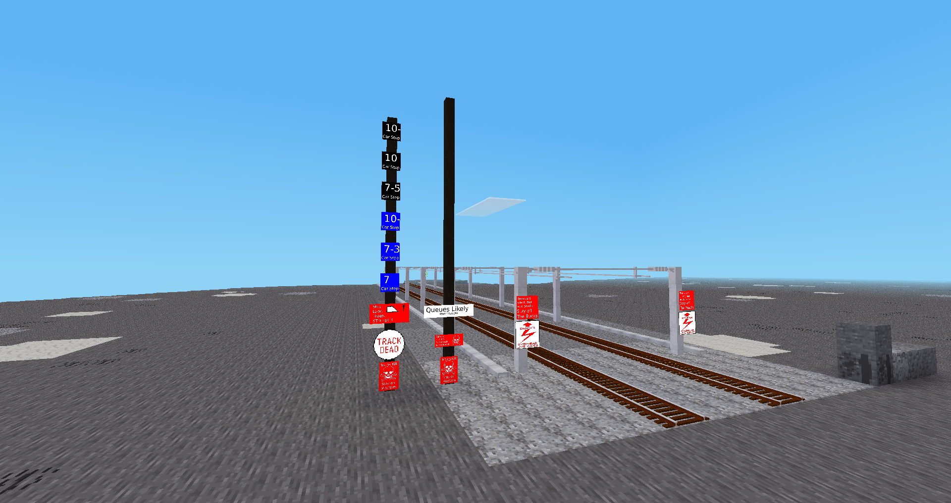 However I find the art a bit inconsistent and there are a few assets for signs that may have been copywronged from railsigns.uk, despite being attributed (the author should recall that in the absence of a licence statement, copyright remains all rights reserved). I also think the author missed a big opportunity to use display_modpack for the plethora of 'Stop <color> of <x> cars' signs - simply allow writing two numbers in a formspec attached to the sign. Then only one sign node definition is needed per colour. A consistent font or small set of fonts and texture resolutions should also be used instead of a mix of pixel and smooth fonts. Some signs also have a very tiny size in the world, which makes them illegible from more than about half a metre away, yet they still have the same size selection box. Others have a very high resolution which causes a big framerate drop whenever they are wielded in-hand; a separate in-inventory image can address this.