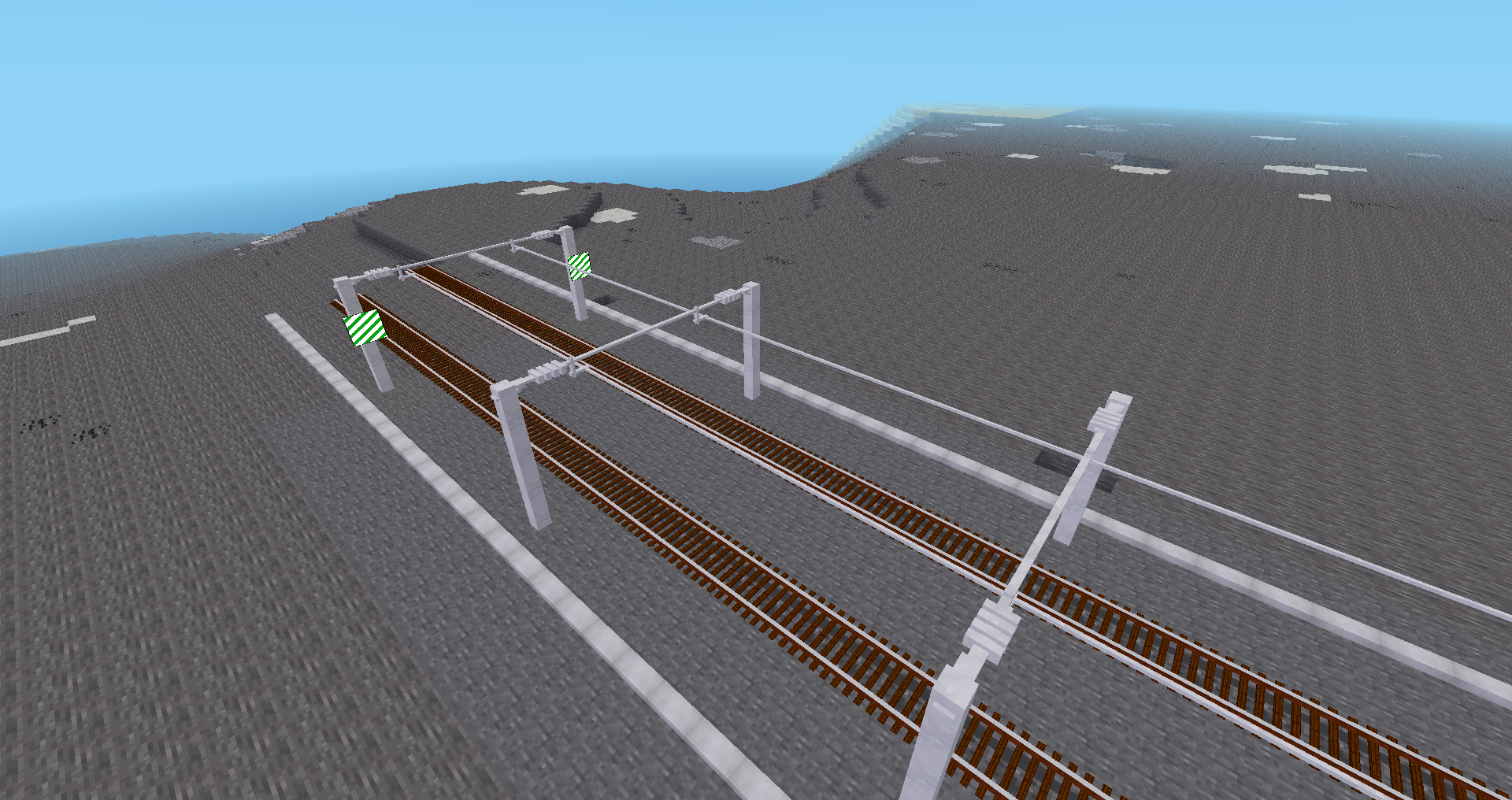 The overhead line equipment, or as it's referred to in-game "OLE" without explanation: I like the idea of modularity in height and flexibility of track spacing. However, the lack of any wire at 30 and 45 degrees to match the track is a bit dissapointing, even if it would take a lot more to implement. Also, this is not actually the first attempt at OLE for Advtrains - MBB actually made a more basic system back in 2017. Although the britsignals OLE is more complicated and a bit thinner on the wires (which is usaully more desirable), the MBB mod actually manages to get a better colour contrast including darker cables and has a separate messenger/return wire .