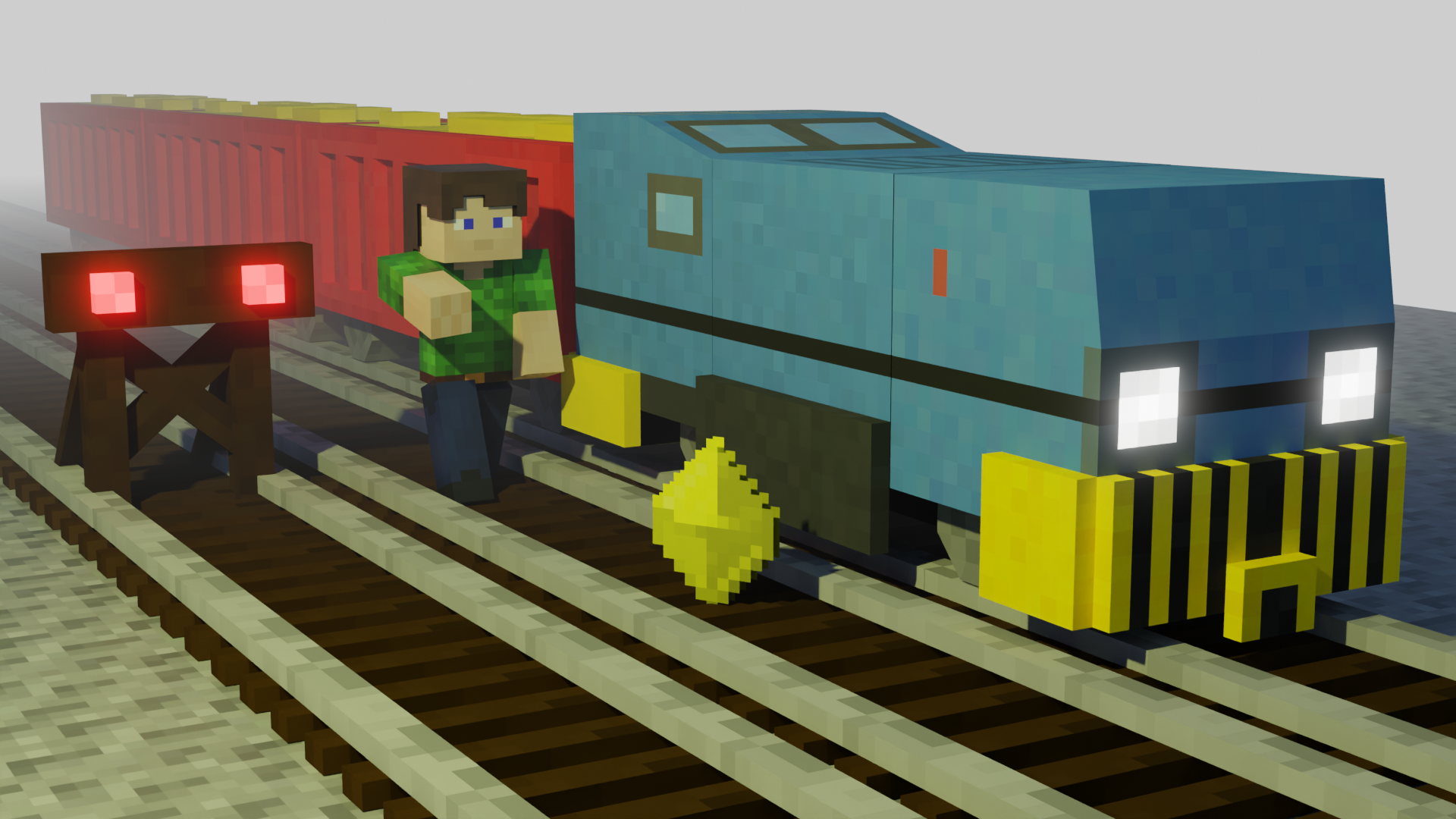 The game is quite simple: You are running on a railway. Using left-right controls, you can switch the lane, slide using sneak and jump using space. Specific obstacles require exactly one way too dodge. The theming is for the most part well done: A proper screenshot was rendered, an icon created, the game uses models made during the jam, formspecs were styled neatly.