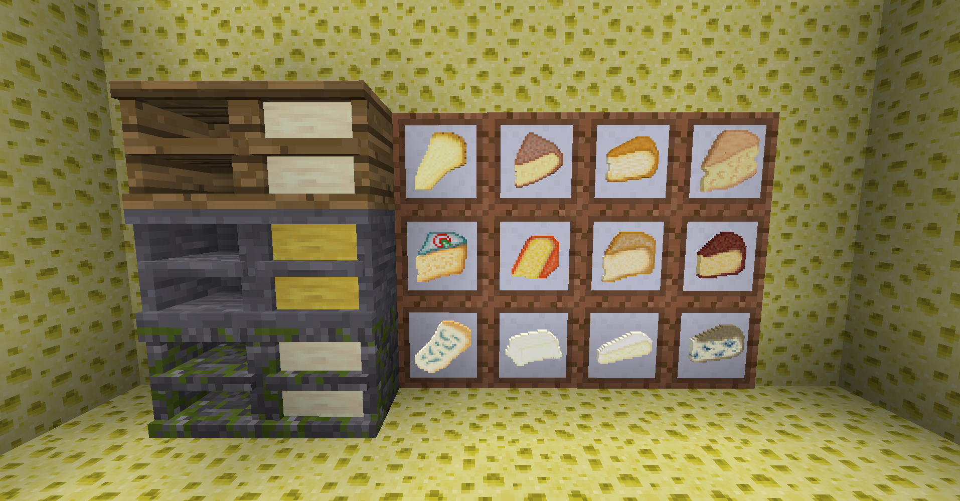 Actually... there are a few more cheeses, that you can craft instead of wait to age. You can use Curd with water and salt to craft Stretched Cheese, and give it a shape, making Mozzarella, Scamorza and Caciocavallo. Scamorza can be eaten as it is but it satiates more if you cook it into Smoked Scamorza. You need some string to craft Caciocavallo and cannot be eaten as is. In needs to age by hanging it on a wooden ceiling in the dark. I know, when i said that there is Mozzarella, you would want a pizza, right? Not here, sorry. This mod only provides cheeses. Their uses are on other mods using this one.