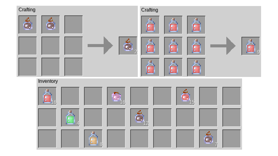 Provides a stackable potion (just place a normal potion in the crafting table to get a stacked version)