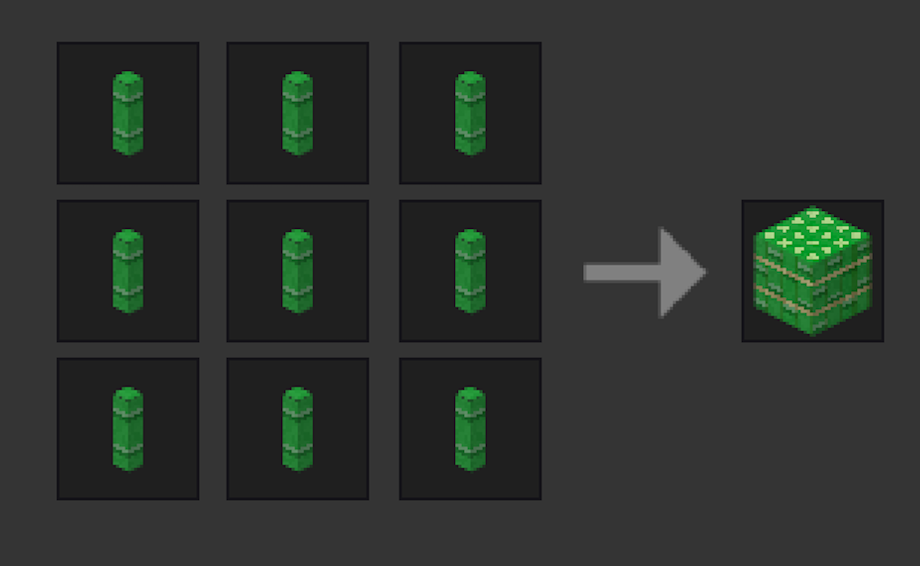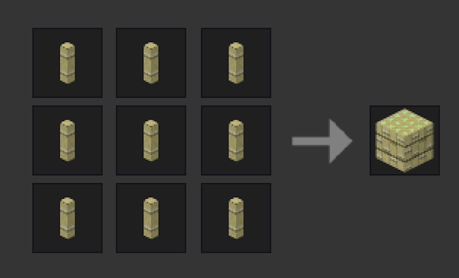 Bamboo can be crafted into bamboo bundles for decoration or storage by placing nine bamboo sticks in the crafting grid. This recipe is reversible.