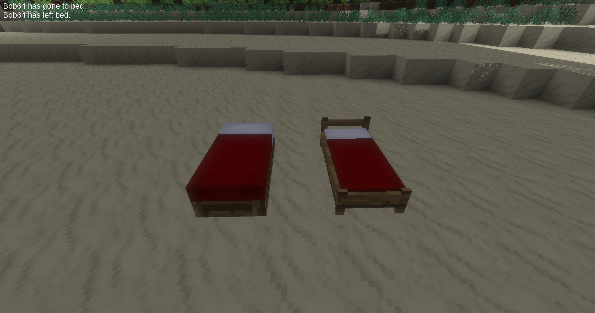 Bed Notifications adds a feature that when a player leaves or enters a bed a chat massage is sent to all players telling them that a specific player entered or left a bed so that it is easier to skip the night on multiplayer worlds. It also sends a message to all players when they are able to sleep. There is also some functions to add support for other beds. See api.md for details and documentation.