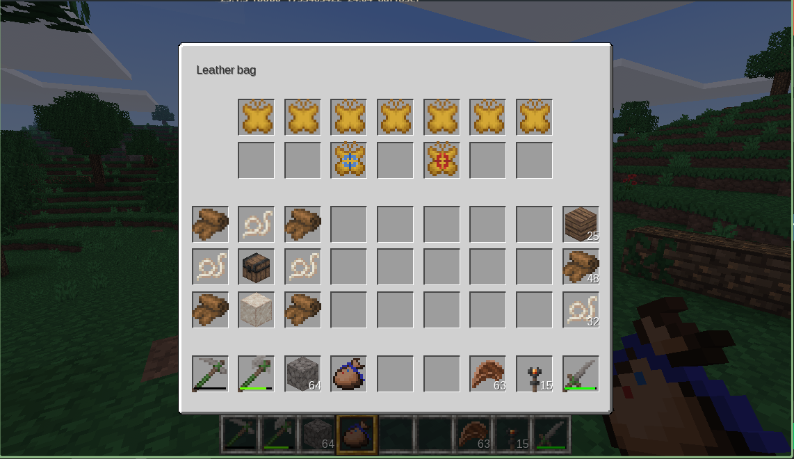 This mode adds bags - items with chest-like inventory. Right click with it in hand to open its contents. Sneak right click on other chest-like blocks to offload content. Use upgrade pin with bag in offhand to apply it to the bag. You can color leash with dye or by crafting bag with colored wool. Bag content retains on craft (to color the leash or upgrade bag tier). Please report any instance of item voiding or duplication, connected to this mode.