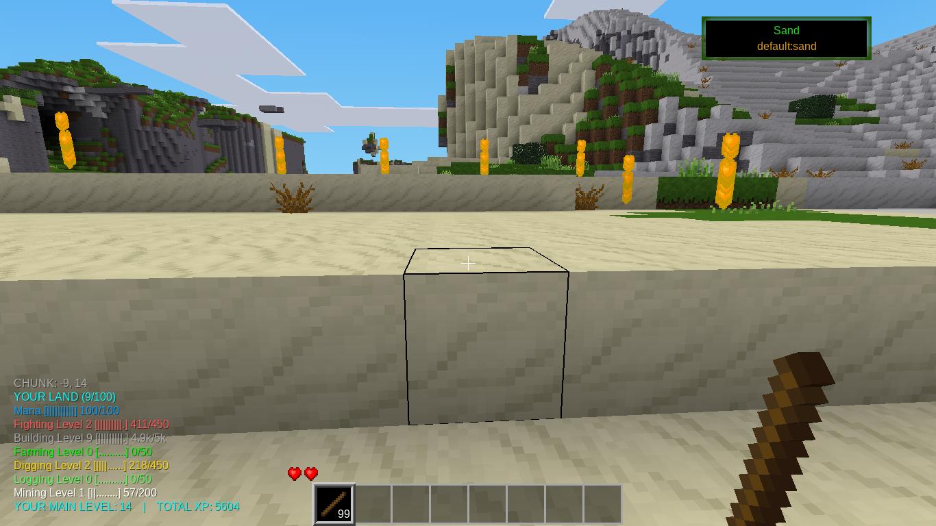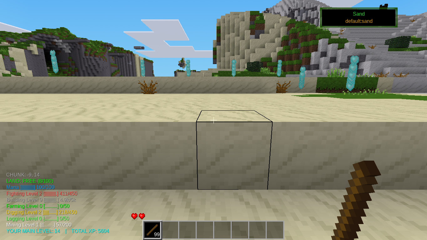 - Fence: When you hold a stick a fence appears to show you where the chunk is. A blue fence means it is free land. Orange means that you own the chunk. Red means that the chunk is owned by another player.