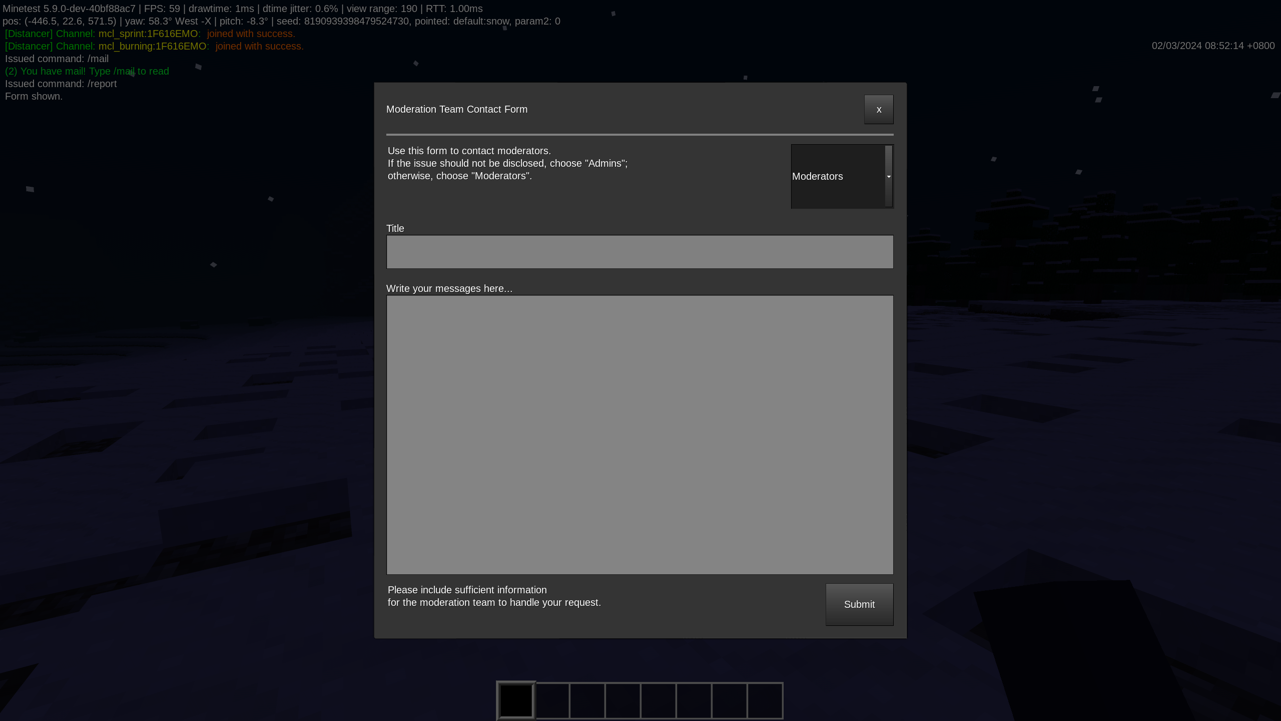 This mod defines two mailing lists, admin_mail:admins and admin_mail:moderators, for contacting all players with privs and ban privileges respectively. Additionally, a form accessible via /report command is created, giving players a way to submit tickets without messing up with the name of the mailing lists.