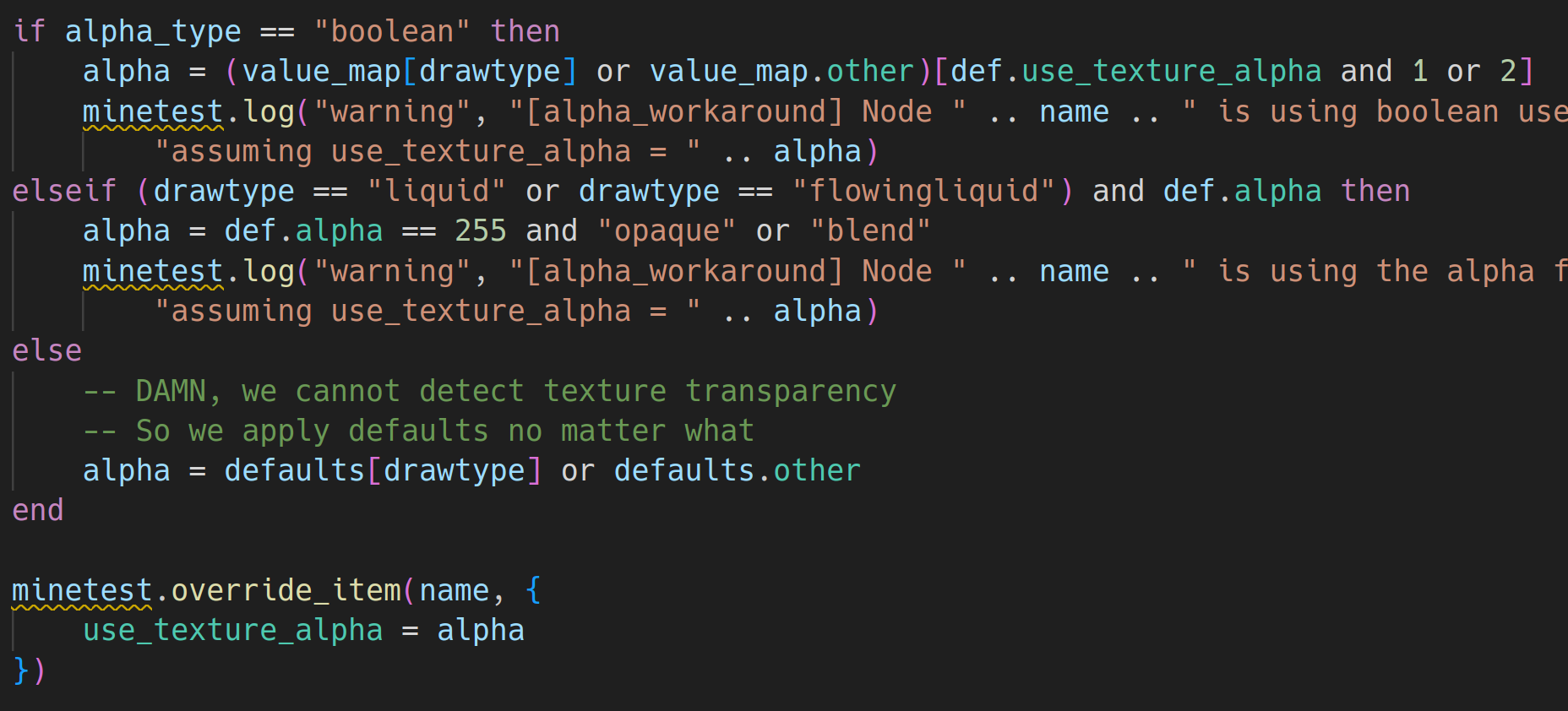 use_texture_alpha workaround 🔗This mod converts boolean use_texture_alpha values to string on the server, allowing MT5.9+ clients to join.