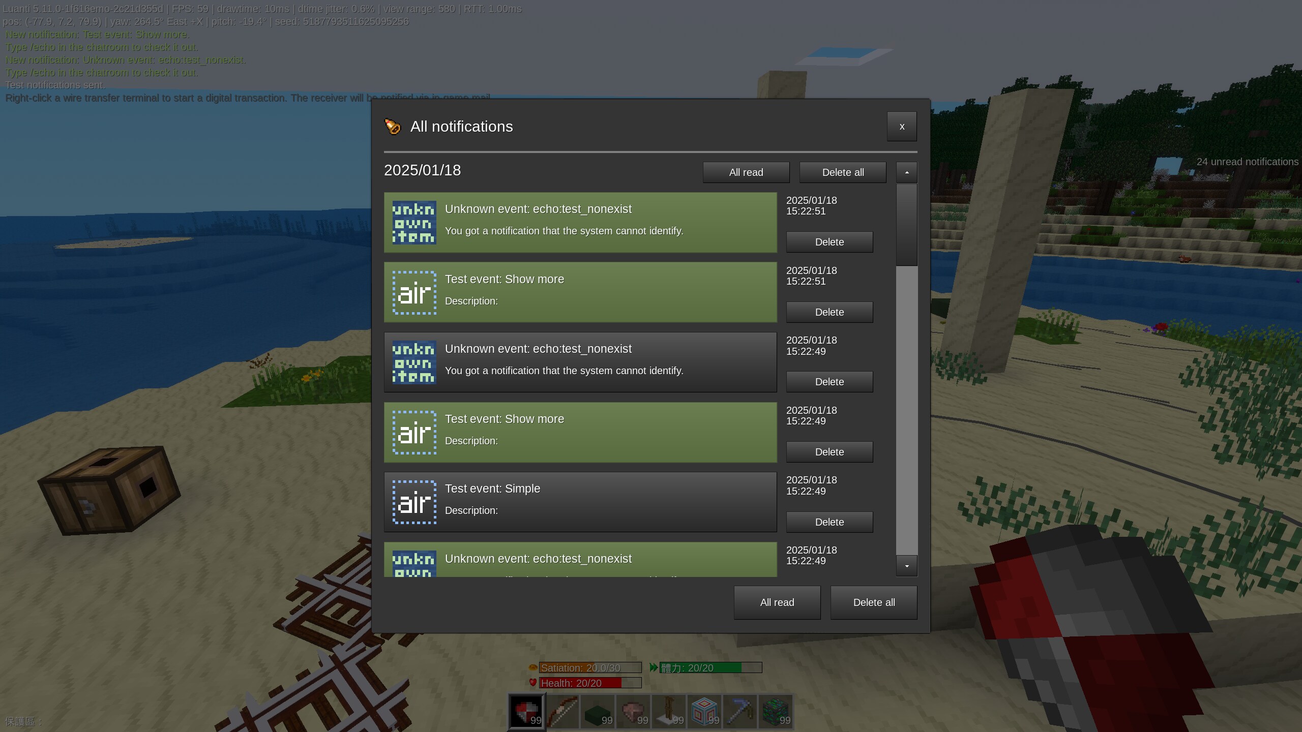 This mod provides a better and unified interface for handling in-game notifications. All notifications are stored across server restarts and are accessible anytime until the user deletes them.