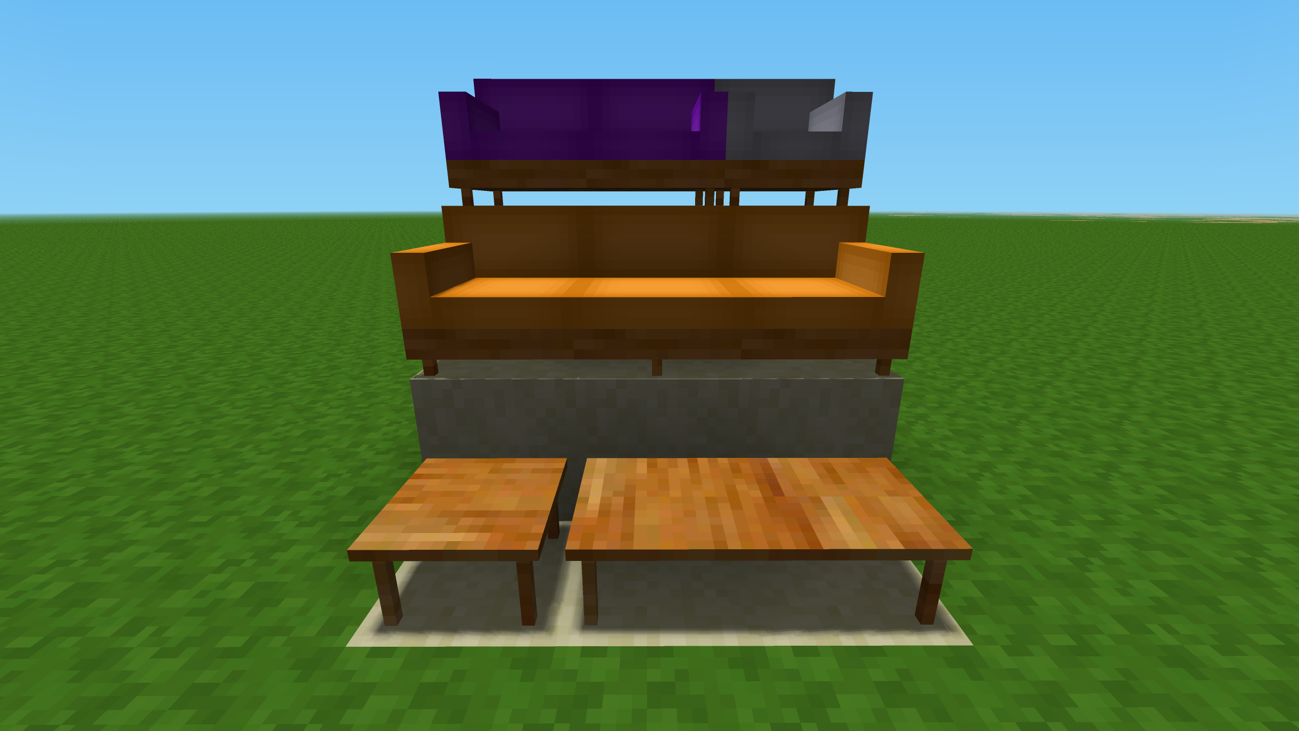 When you right-click on a long sofa, sofa or armchair, it transports you onto it, and replenishes your HP. Good if you've just escaped nasty mobs, didn't fare so well in battle, or just had a bad fall. The coffee table - which isn't coloured, just wooden - is pretty much just for decoration. It stands half a block high and nearly 2 blocks long. The end table is similar to the coffee table, though roughly half the length (i.e. only one block) and square.