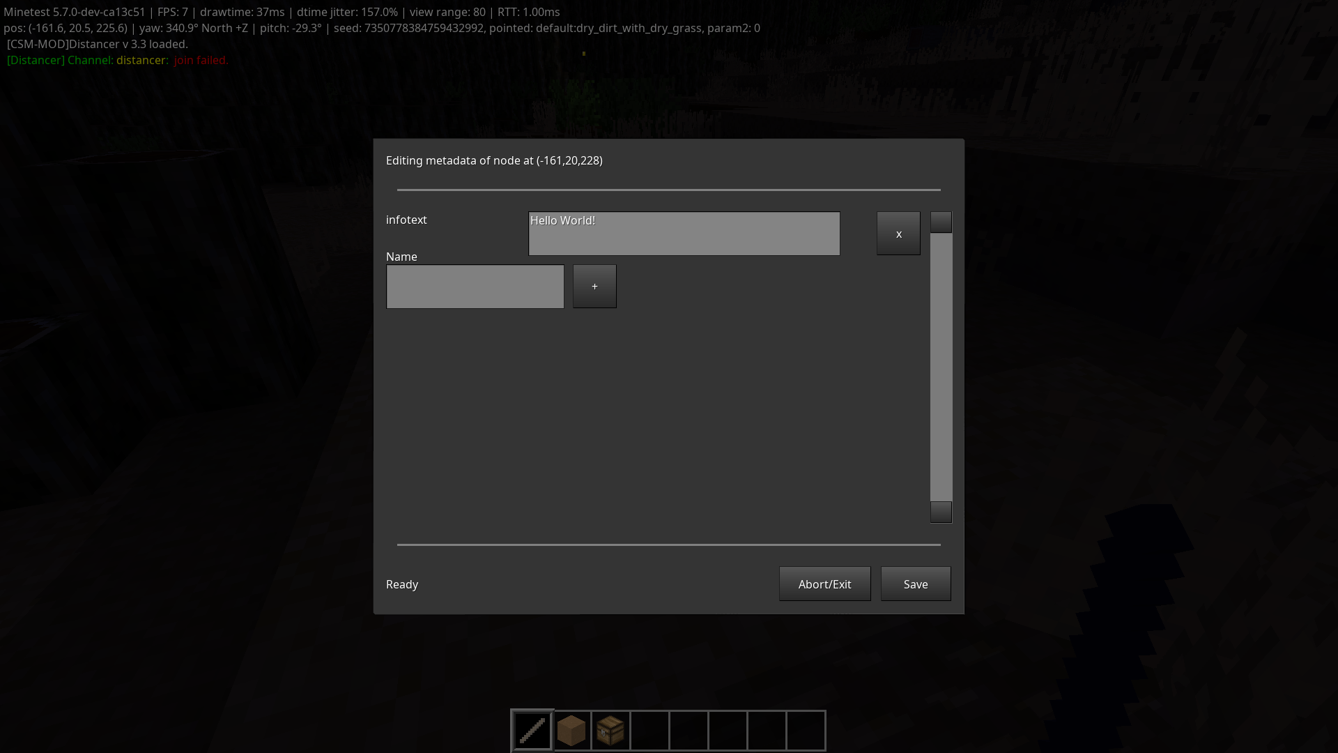 With this tool, you can view or edit the metadata stored inside nodes, which can be used to modify node ownership, or set custom infotext. Only nodes not protected or owned by the player can be modified, though admins can always do so.