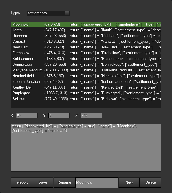 Caution: This interface lets you access the guts of the data stored for each waypoint, only make edits if you know what you're doing. You can disrupt other mods that may be using waypoint data to store information. In the pictured example the "settlement_type" property is specific to the mod that is using named_waypoints, so changing or removing this value will cause undefined behaviour.