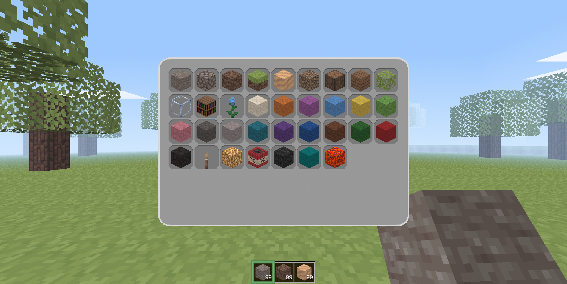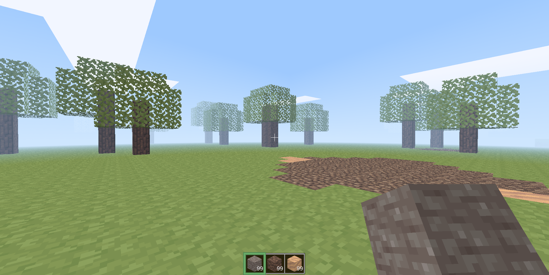 - Three-slot hotbar (preloaded with blocks)