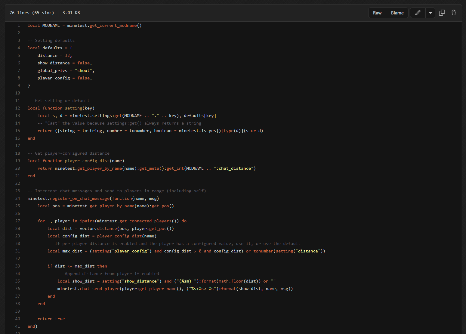 proxchat.distance: Distance at which chat from nearby players is "heard" (default:32)proxchat.show_distance: Show the player distance in chat messages (default:false)proxchat.global_privs: Privileges required to use/global(comma-separated list, empty for anyone) (default:shout)proxchat.player_config: Whether or not players may configure their own hear distance (default:false)