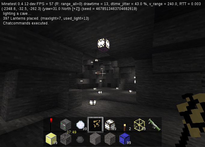 Add two chatcommands to automatically light up dark places (e.g. caves) with lighting nodes such as torches.