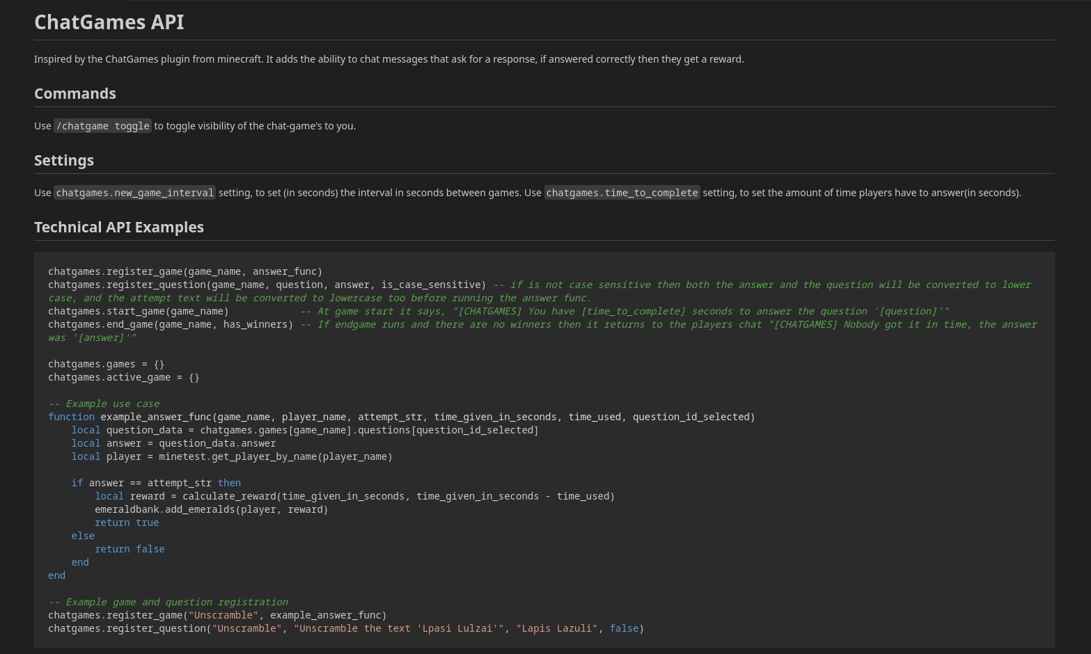 chatgames.register_question(game_name, question, answer, is_case_sensitive) -- if is not case sensitive then both the answer and the question will be converted to lower case, and the attempt text will be converted to lowercase too before running the answer func.