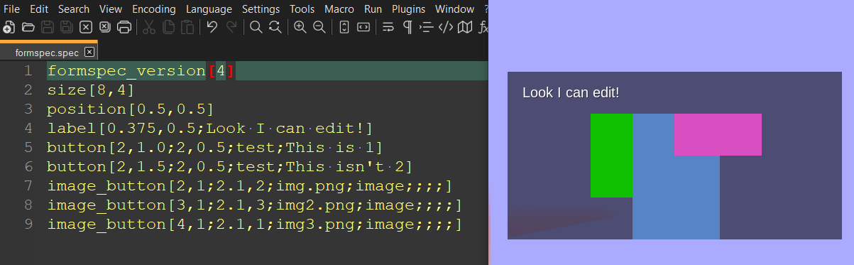 - To make edits, open the file in your editor of choice and make changes as you see fit. When you hit save, the formspec will auto-update. Best when used side by side.