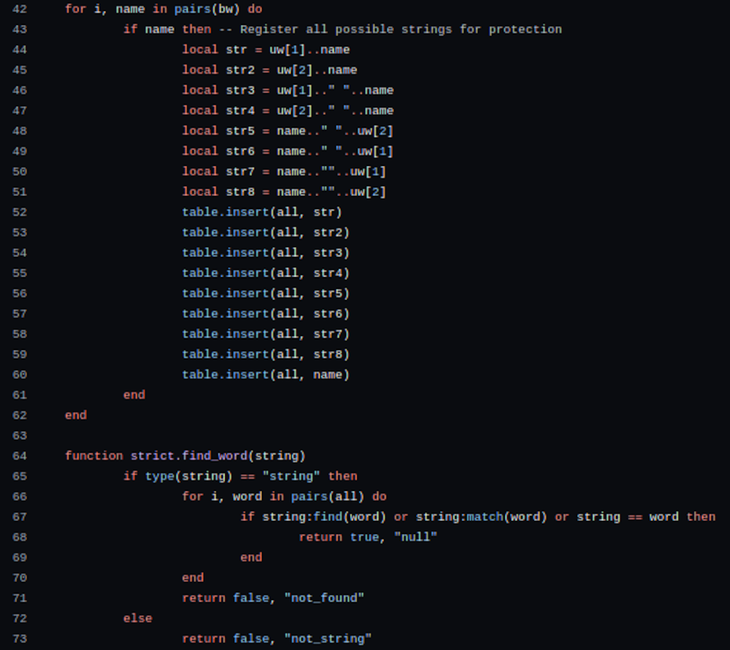 strict: Is the main table of the modstrict.find_word(string): Find a bad word (cursed or swearing), returns true if it hadstrict.random_word(): Returns a random bad wordall: Is a another table, containing all bad wordsbw: Is an another table, containing bad words (Not same asall)