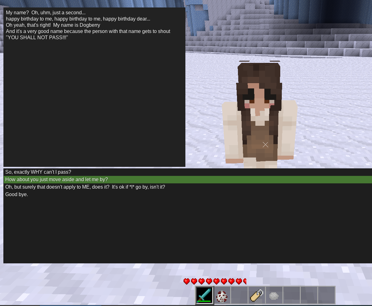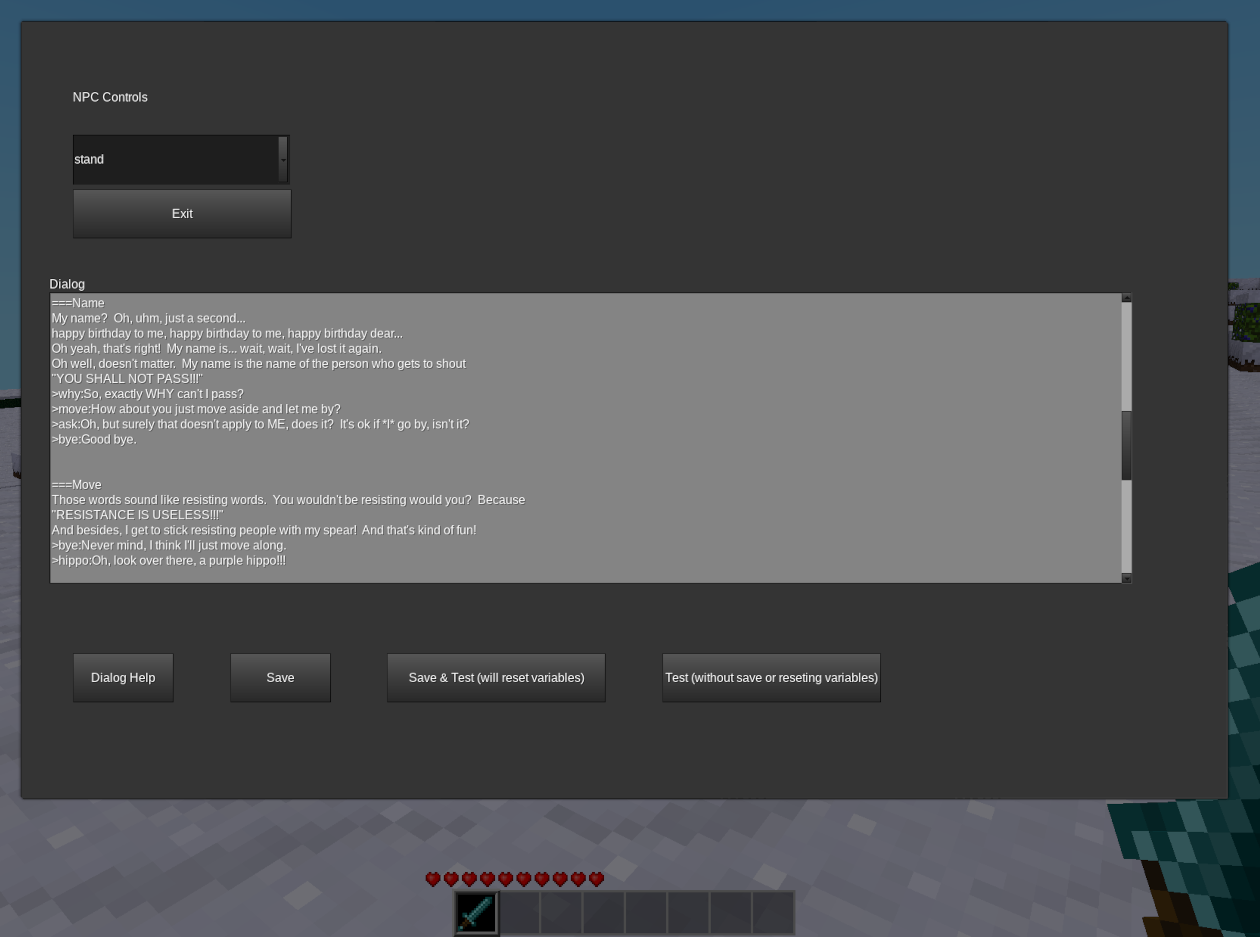This means that any player who has ownership of an npc can create their own customized dialogs for that npc. A player building a shop can write a dialog for the npc shop keeper. A player who builds a huge castle can craft their own custom dialog for the guard at the gate to tell people about the castle. AND, since the control mechanism is just text, the players have no direct lua access, avoiding some security risks.