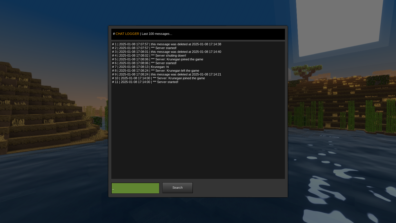 Chat Logger 🔗 Allows players to view the last 100 chat messages, also allows you to search for keywords License 🔗 MIT License (MIT) for the code.