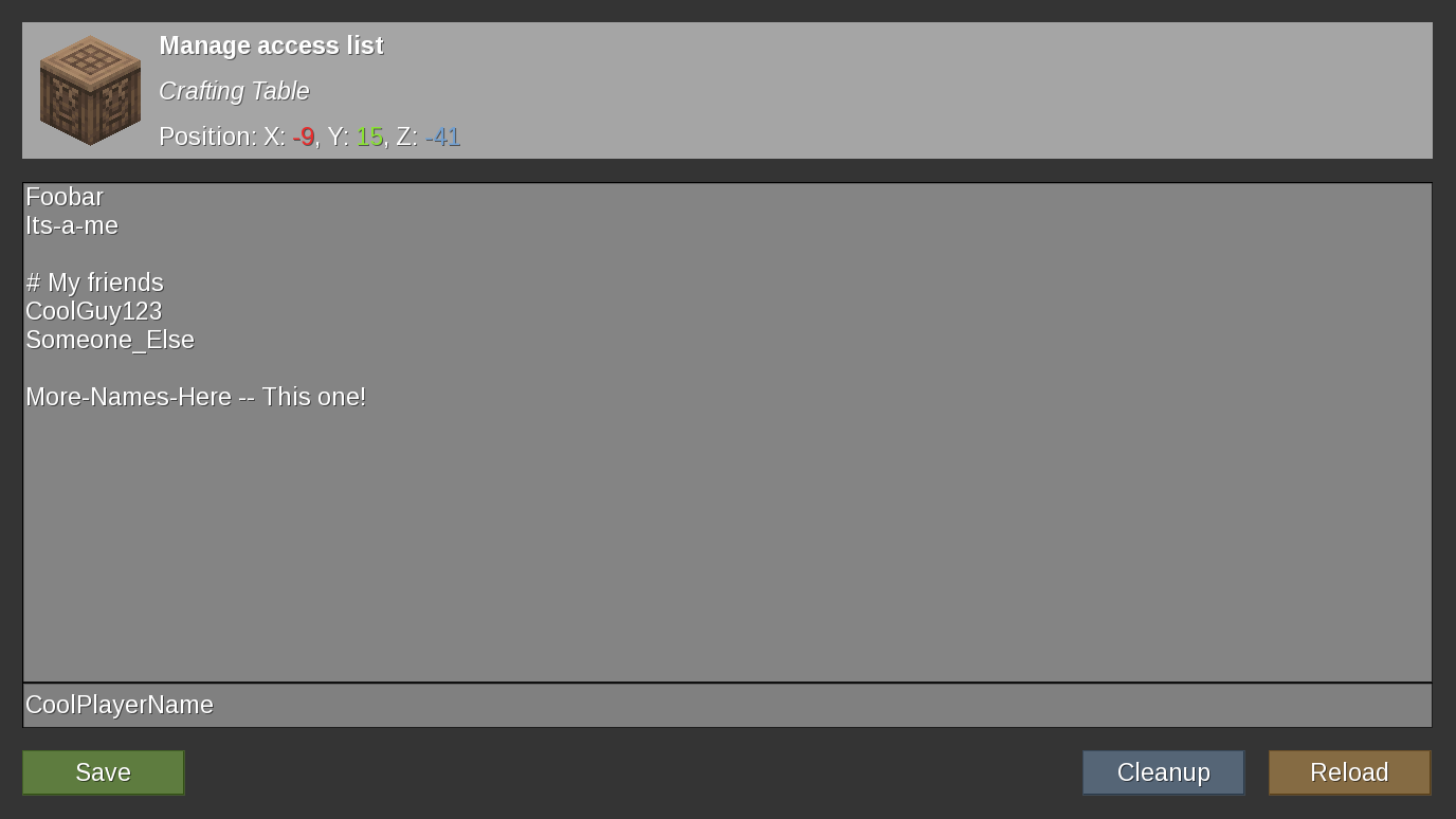 This mod provides a game-agnostic API to limit node interaction based on an access list. The owner of an access list can add player names to grant them access to the node or feature the list controls.