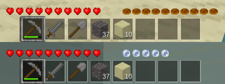 The mods adds a hunger bar at the position of the breath bar and hides the bar if the breath bar becomes visible so the most important bar is shown without cluttering the UI too much.