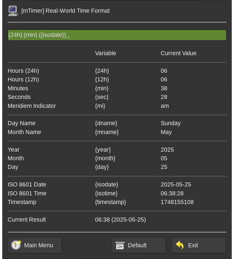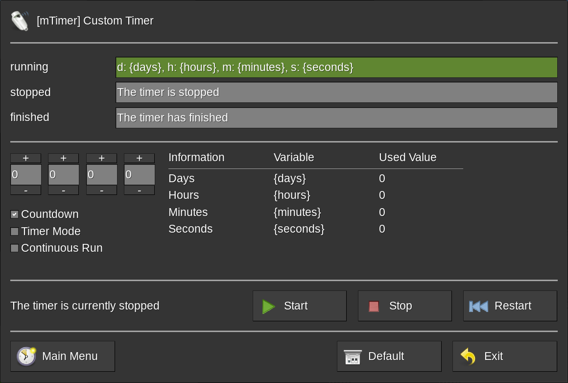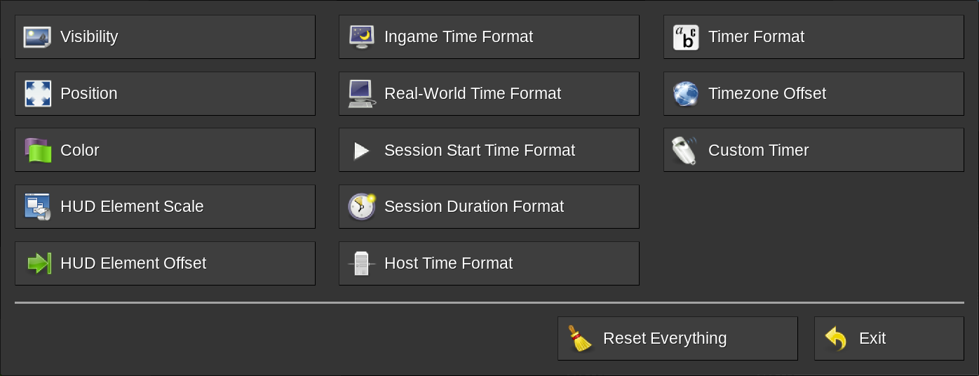 The timer display and settings are entirely configured on a per-player basis via configuration formspecs. For opening the main menu simply enter the /mtimer chat command. From the main menu all configuration formspecs are accessible.