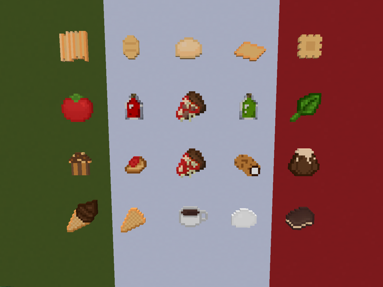 This mod adds a variety of traditional Italian foods, ingredients, and cooking tools to Voxelibre and Mineclonia, enhancing survival gameplay with new farming, crafting, and potion mechanics. Grow fresh tomatoes and basil, craft delicious meals, and enjoy new gameplay mechanics like potion effects. Perfect for players who love farming, cooking, or adding some cultural flavor to their game.