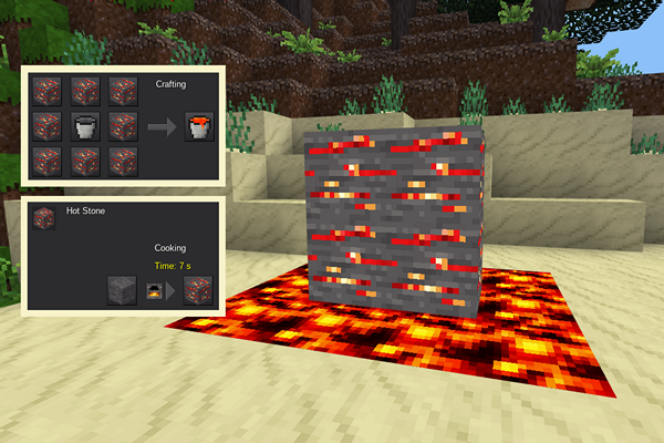 Basically enables crafting lava in Minetest from 8 of a new node called Hot Stone and a bucket, the hot stone can be obtained from baking default:stone in a furnace.
