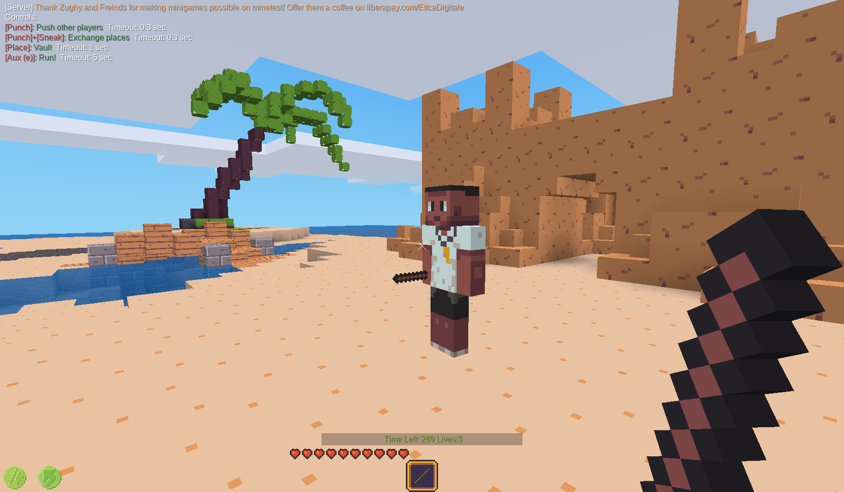 Punch other players with the pushstick to shove them far away. Right click with the stick to vault yourself up over walls to escape your pursuers. Sneak+punch to sneakily switch positions with nearby players and throw them over your shoulder! Knock all the other players off the board to win!