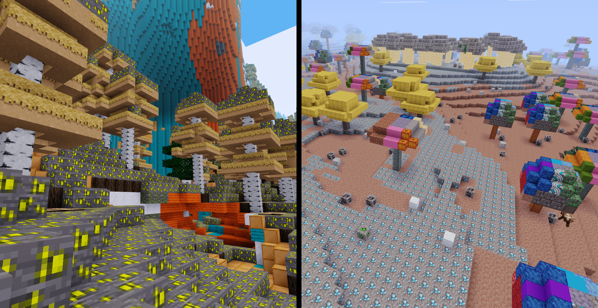 I tested this out with NodeCore, and while the resulting worlds it created are probably mostlly unplayable, it was fun to see some surreal results. There were worlds that were extremely radioactive, some that rapidly caught fire, some that were covered in dungeon stone, and some where pumwater was seeping out of every crevice. There were a lot of wet cement beaches, and trees made out of doors, and grassy fields transformed into a cornucopia of different ores and stones.
