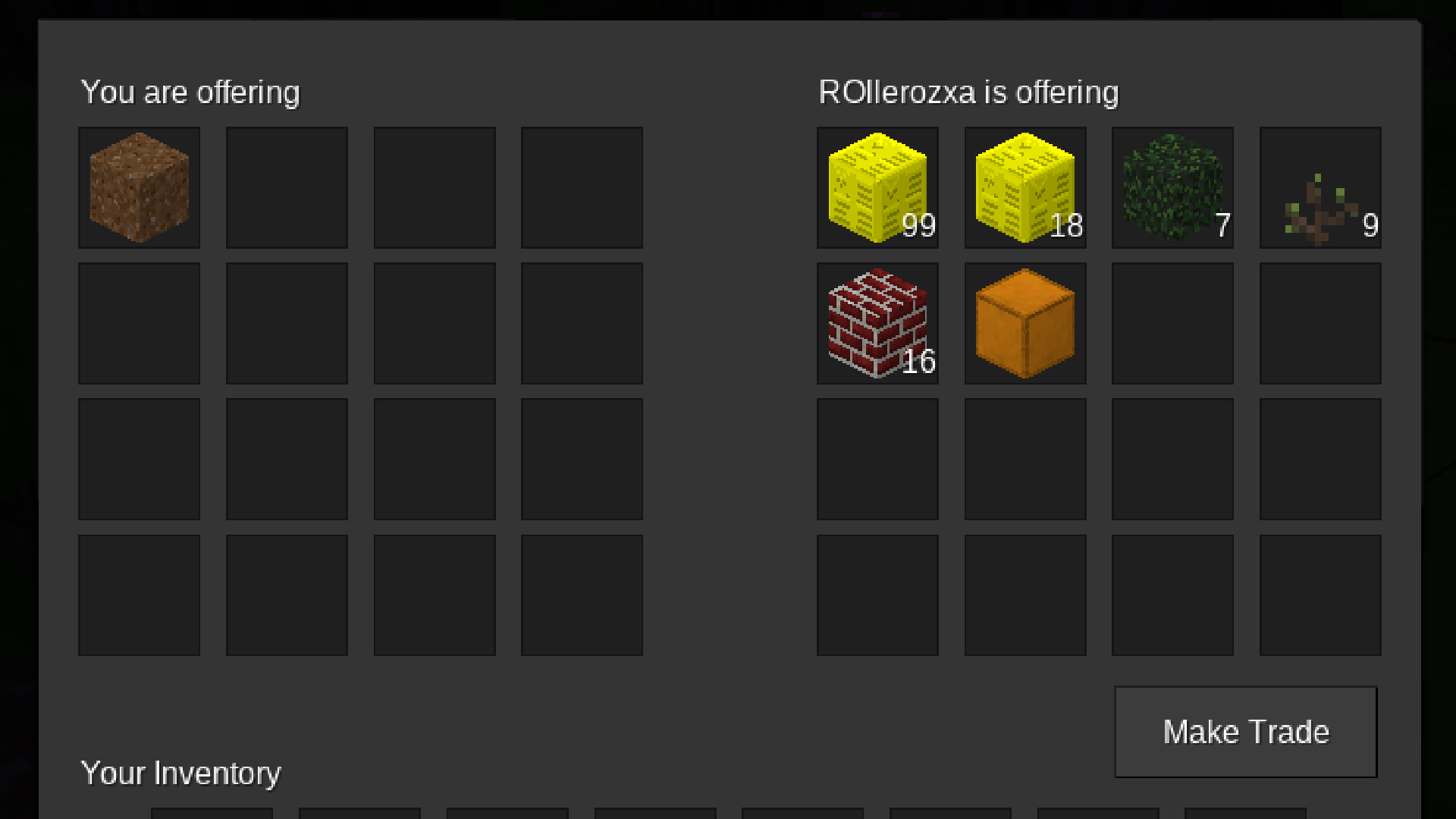 Allows players to trade items with each other via the use of the /trade and /accepttrade commands.
