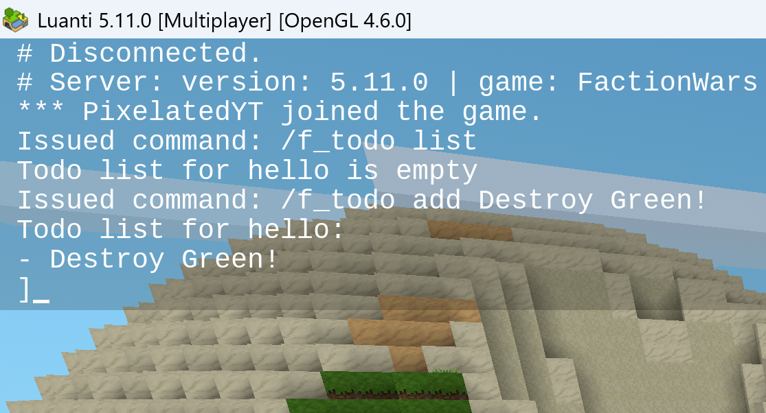 todo.get(faction)- Retrieves and deserializes a faction's todo list from storage, returns empty table if none exists -