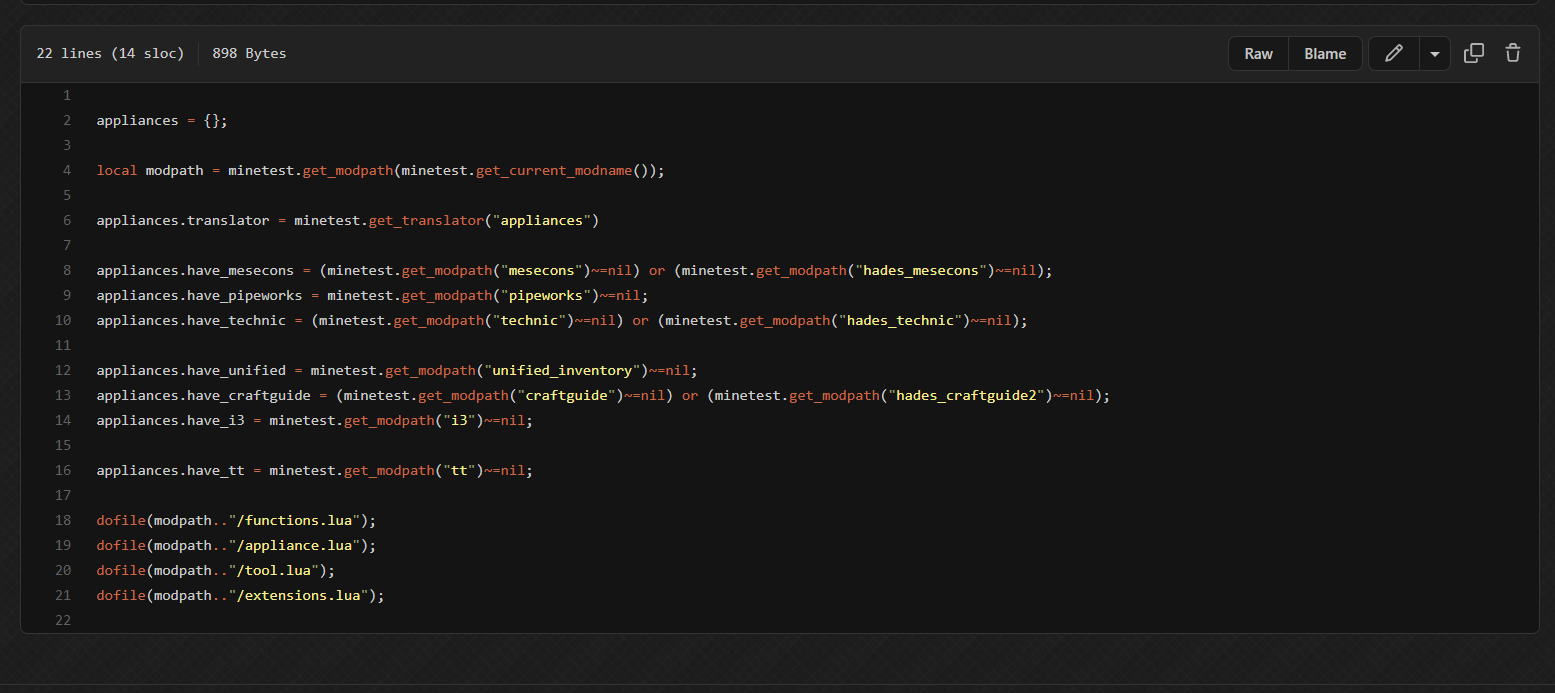 This mod provides an object-based API for easier creation of appliances, machines, etc. Appliances support power by technic electricity, mesecenos, hand. Production can depend on the usage of something, connected water.