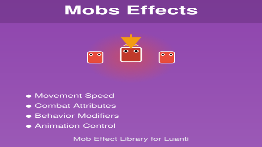 Provides common effects for mobs based on Mobs Redo API powered by Attributes Effects mod. Supports modification of movement attributes (walk/run velocity, jump height), combat attributes (reach, damage, view range), behavior attributes (walk/stand/attack chance and patience), and animation/special features (animation speed, shoot interval, leap ability). See README.md in repository for more informations.