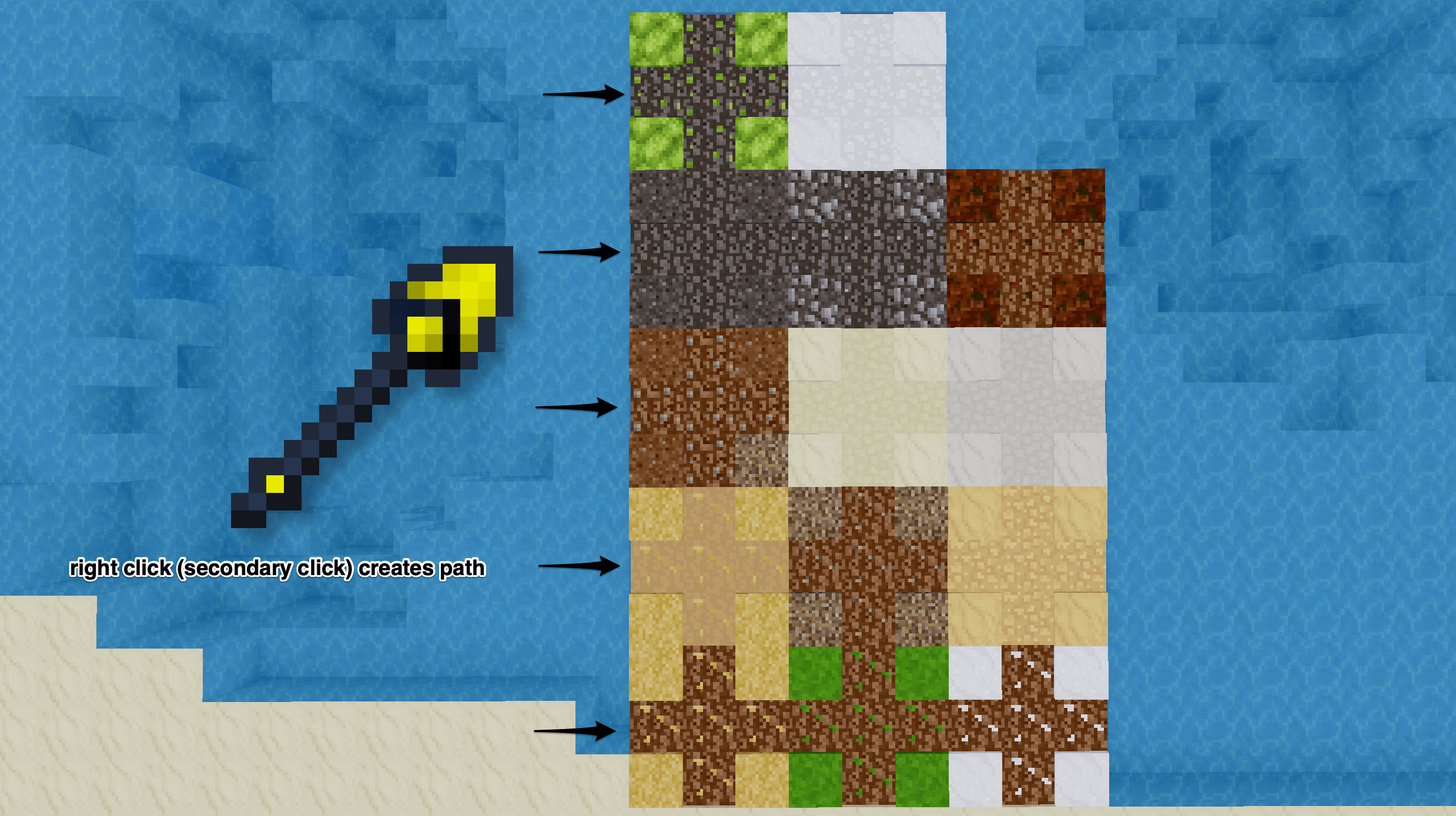 Right-click/secondary click will create paths on supported blocks (all dirt, sand, snow, permafrost from MTG are supported).