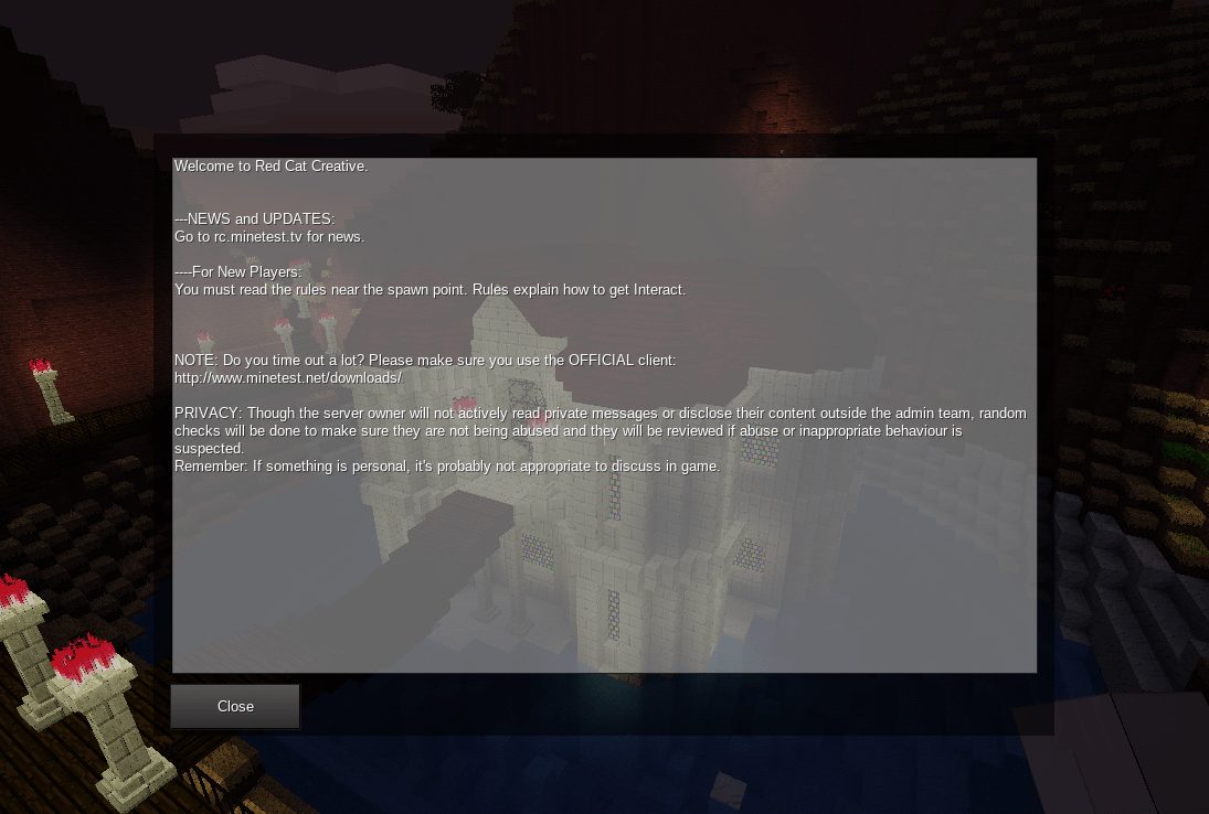 This displays a news formspec when the player joins. To set the news text make a file named news.txt in your world directory. The contents of this file will display as the news. When changing the contents of the file, there is no need to restart the server for it to update in game.