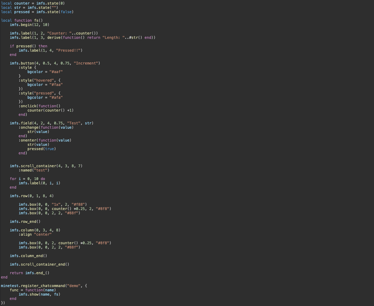 Imfs is a reactive, immediate-mode functional abstration over Minetest's often cumbersome string-based formspec format. What this means is that: