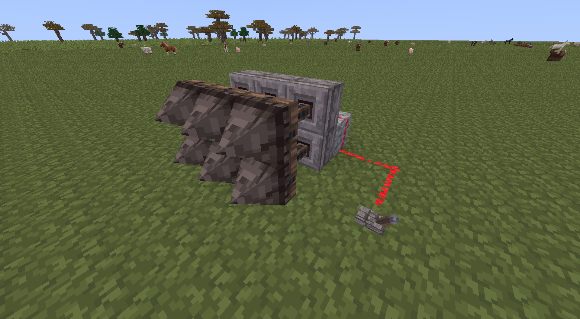 Spikes can be crafted from various types of tree, and placed in any direction. Players and mobs take damage when touching spikes, and extra damage can be dealt by extending the spike on a piston.