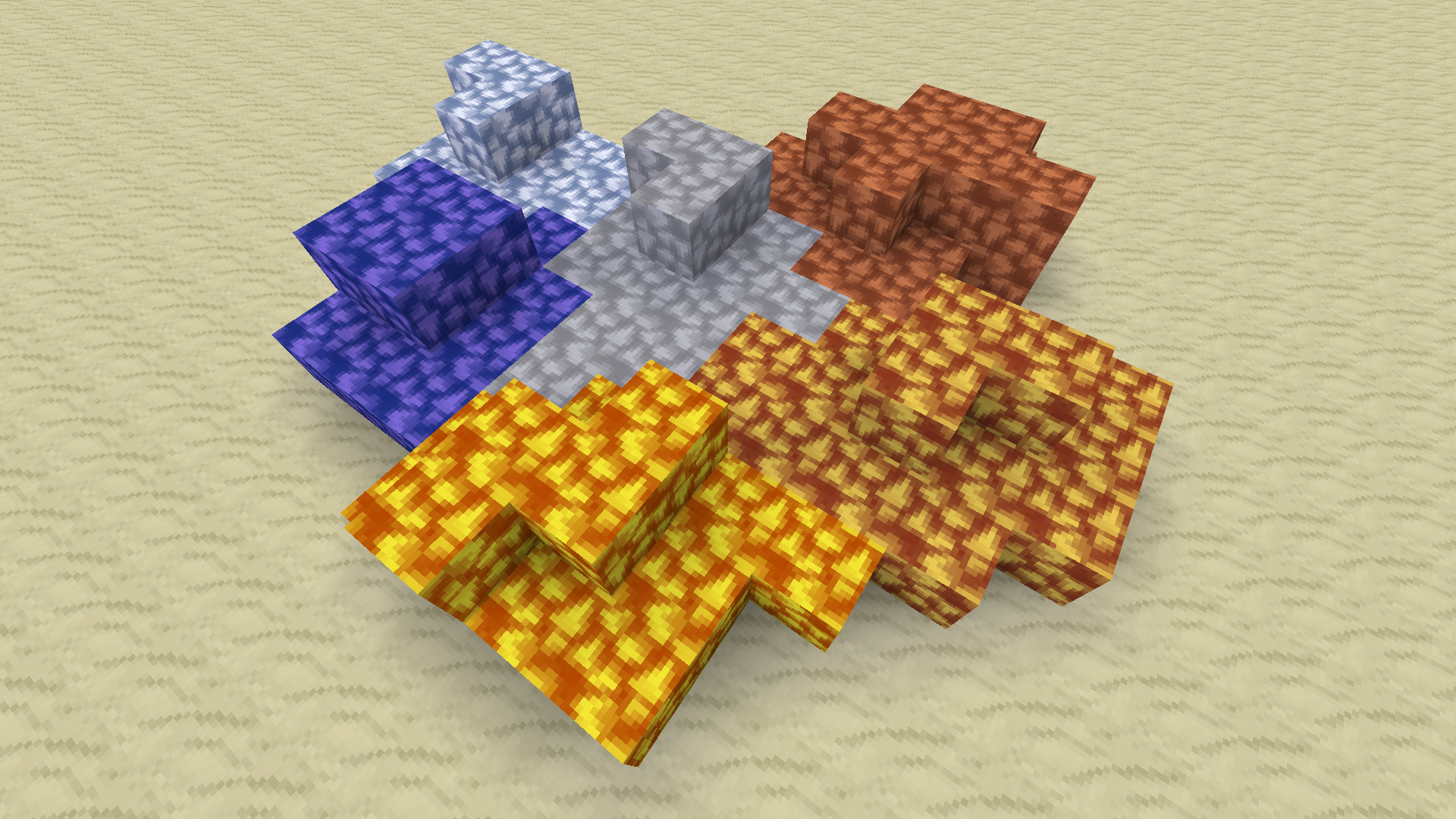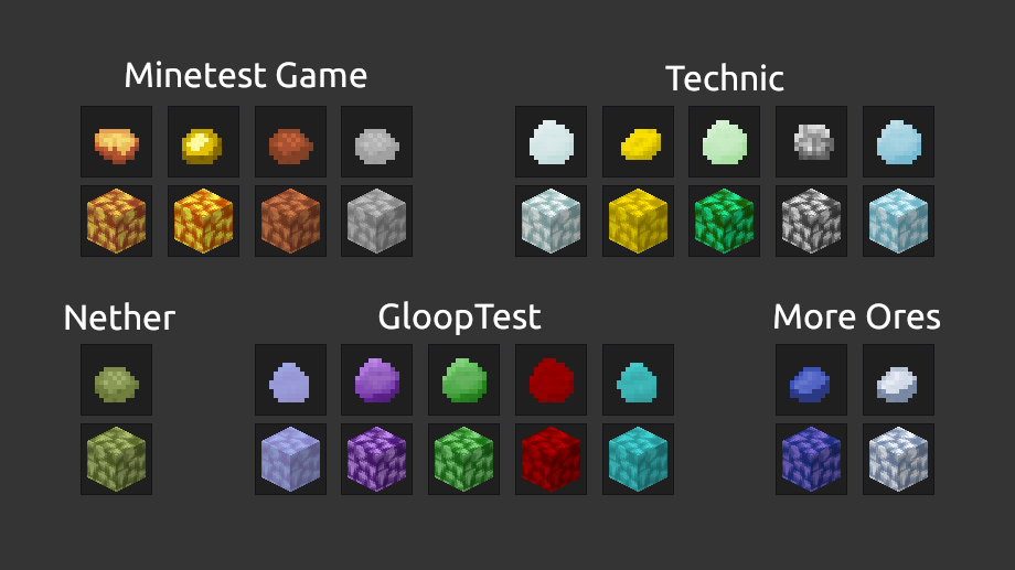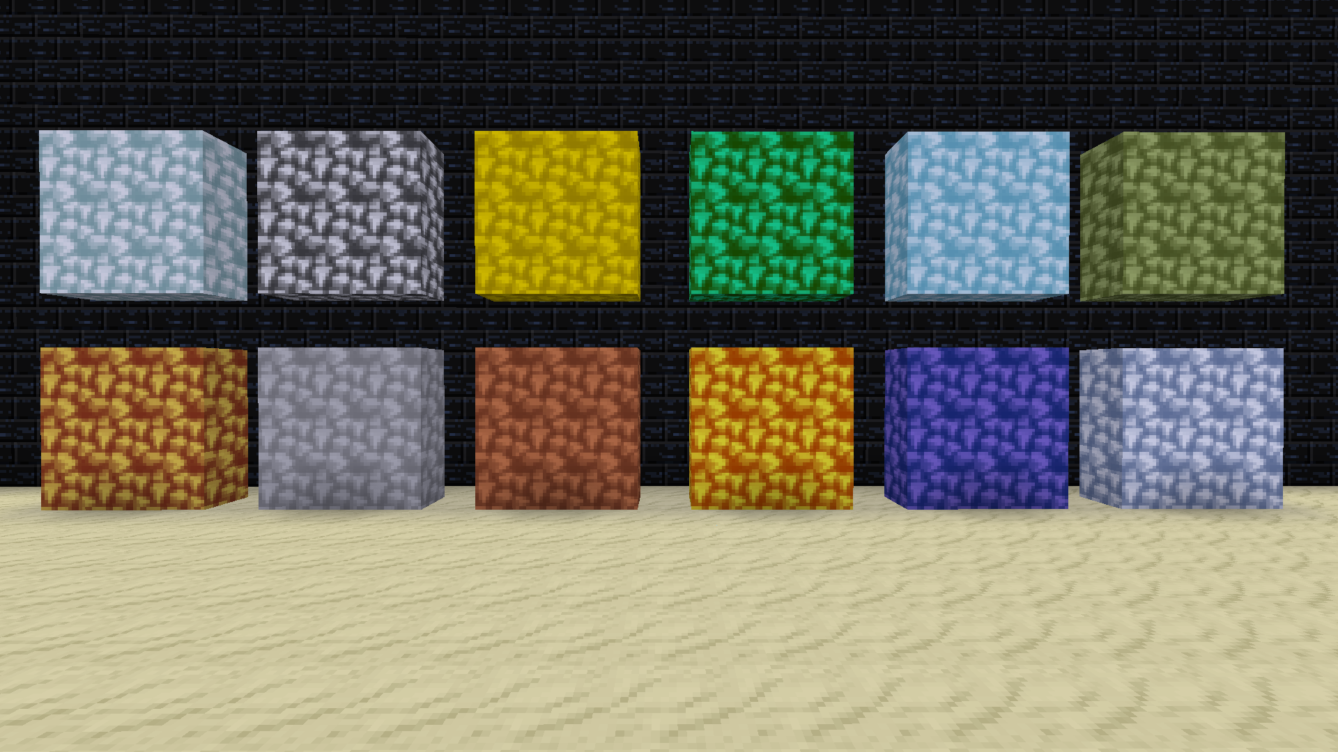 Raw Ore Blocks adds compressed block forms of metal lumps. These blocks can be used for efficient storage of raw ores, or decoration.