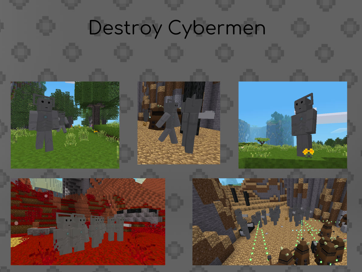 Thanks for making this mod. Really well made, great textures and sounds. Good clear notes that are easy to understand are very helpful. Cybermen and daleks fighting is very cool. Walking into the Tardis for the 1st time was incredible, with it being so big and so many rooms available. Findbiome gui and waypoints in the Tardis is very good, and pulling the lever for the first travel was very cool; just the right sound and effects. The giant 240-slot chests have meant I can reduce the size of overbig storage area. Sonic screwdriver is a gift e.g. being able to change sand to silver sand helps a lot, with silver sand being challenging to find. If I had one little request it would be to ask if shift-click items into the chests is planned, and the hold-shift/run mouse over lots of items to put them in inventory. 100% recommend this mod; adds a lot of fun, and thank you very much again for making it.