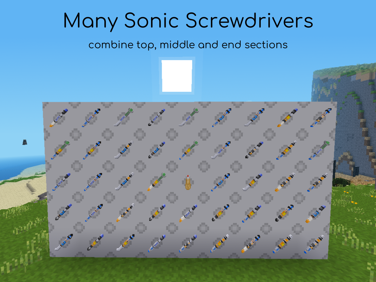 - Sonic Screwdriver: Can be created from a button on the fuctions console unit. You get a randomized texture, out of 4 textures for each third of the screwdriver, creating the possibility for 64 (4^3) unique combinations.