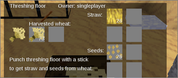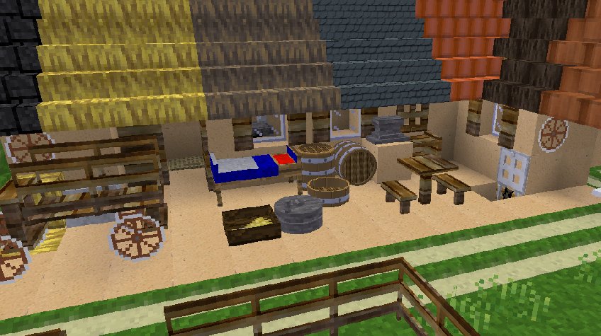 Adds several blocks for building medieval houses: Bed, table, bench, open storage shelf, tub, barrel, wheel, washing place, glass pane, small fence, fence gate, half doors, hatches, wheel etc. Window shuttes close automaticly at night and open in the morning. Build houses using loam.