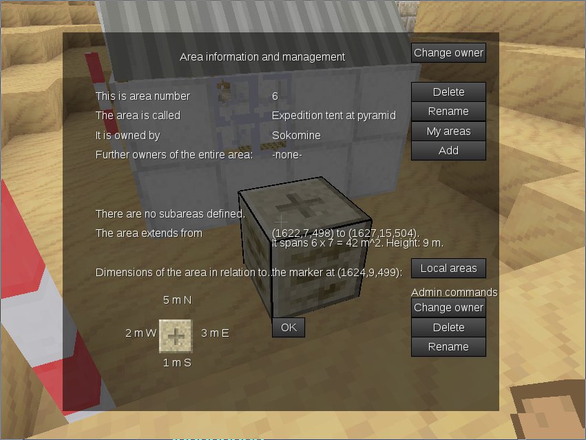Simply craft and place some markers around the area you want to protect and enter a name for the area when asked. Craft and place a marker stone in order to access a graphical interface for the areas mod. No need to learn the chat commands for the protection mod anymore!
