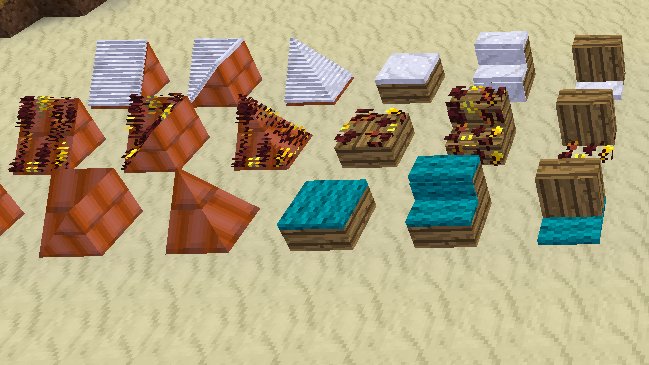 Snow will adjust its shape to the following nodes below: stairs, slabs and fences. With moreblocks installed, it'll adjust to the corner stairs (inner and outer), the panel and the microblock as well. Homedecor comes with 3d roof nodes - all three types of them are supported (minus the raillike flat one). Technic's CNC machine creates slopes and fitting inner and outer edges which are the same shape as those homedecor roofs - and which are also supported (sometimes people use them for smooth grass hills). The cottages roof nodes are treated like stairs.