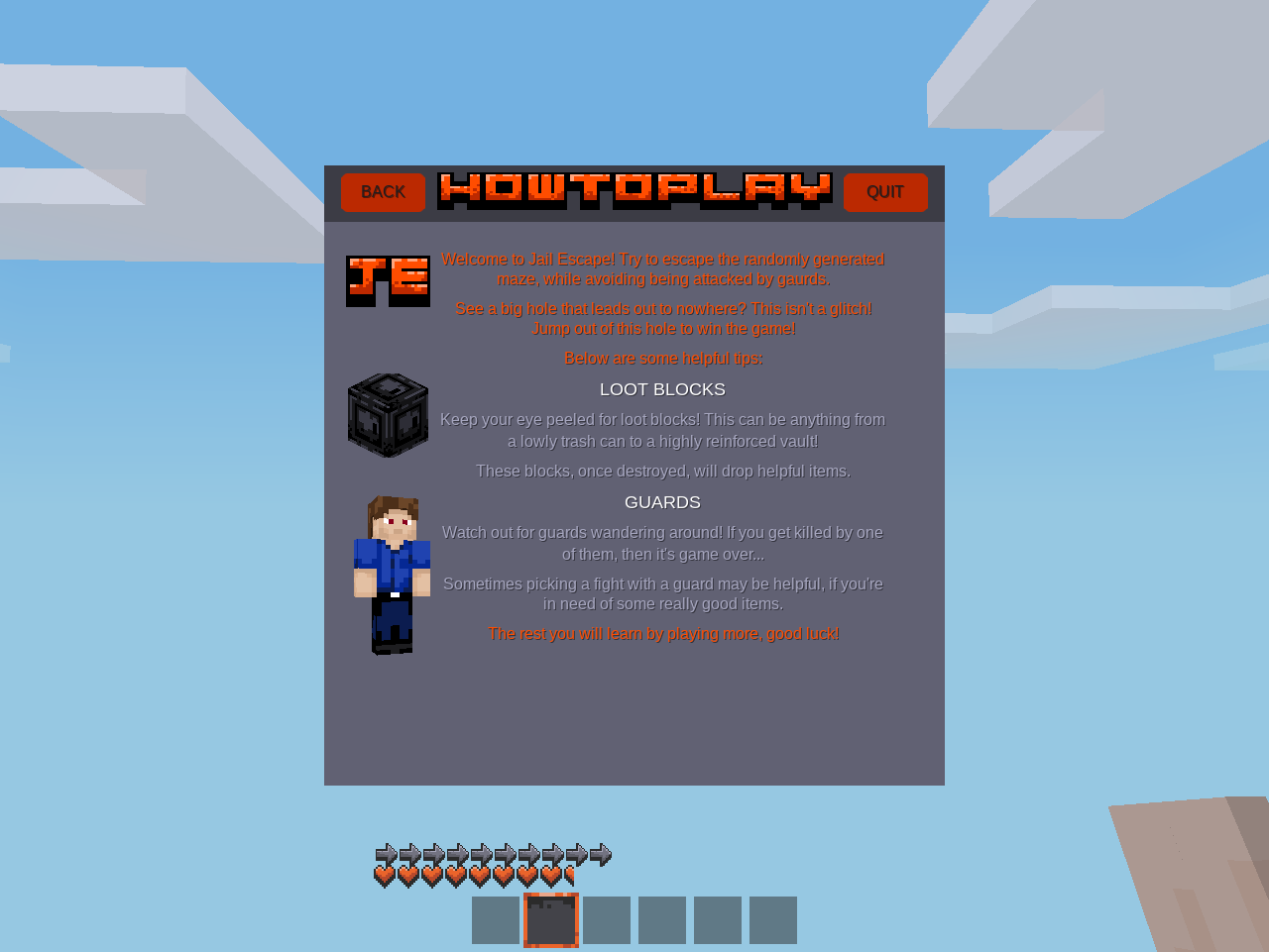If you try to play this game multiplayer, beware that 2 mazes may generate on top of each other, reducing hallways, making mining required. Also, the server crashes any time a player dies. I didn’t realize the goal was to reach the edge of the jail at first, so I was expecting a more obvious exit.