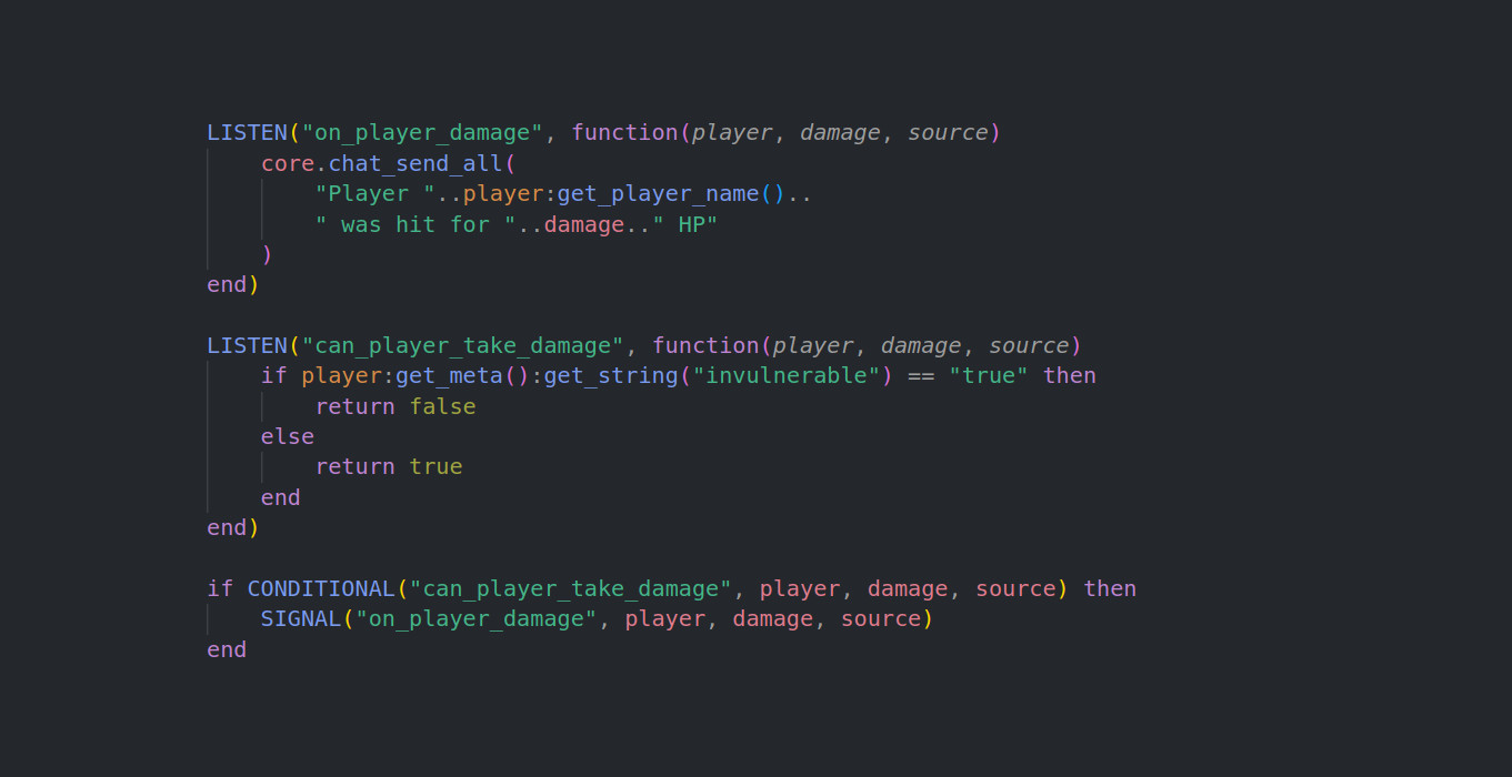 This is a global set of functions that do what they say on the tin mostly. The exception is CONDITIONAL which is a bit more involved (see below). Signals and listeners not only allow you to sometimes save on constant checks by using one-off events instead, but you can also allow extending, avoid some dependencies, and generally make things more reactive and less constant polling. Instead of checking constantly whether the player has just died and then come back to life, we use core.register_on_respawnplayer. This is no different except it is generalised and you can signal whatever thing you want.