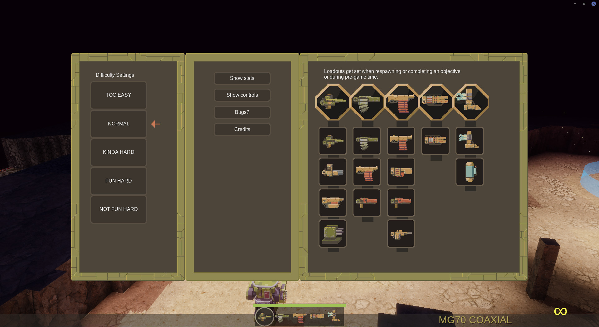 Remember to open the inventory. That's where all the loadouts, difficulty settings, credits, controls and so on are.