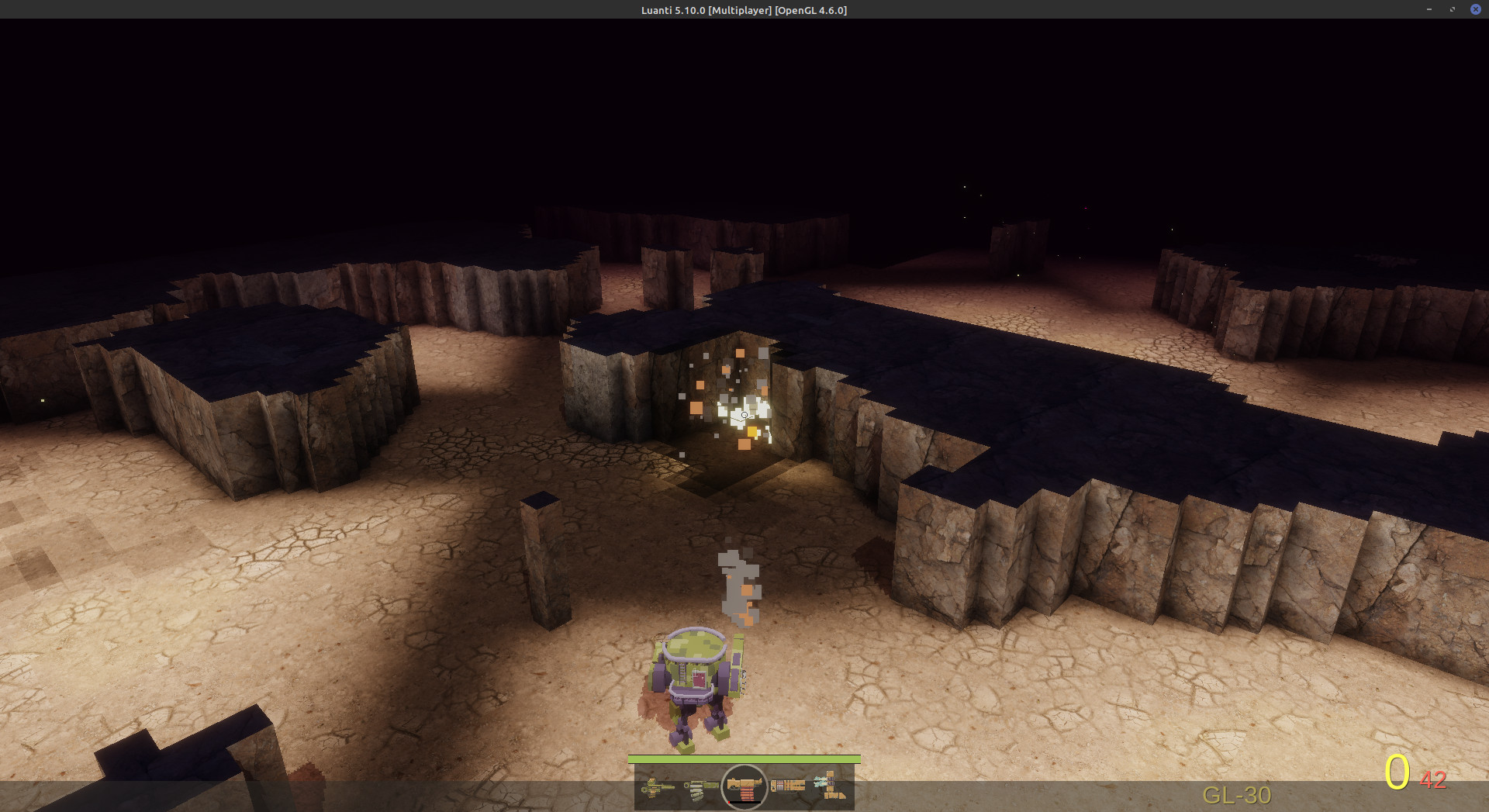But the biggest downside of this game is that it's quite obviously a giant HACK and uses MANY dirty tricks to work. I appreciate the experimentation for a game jam and love that it was attempted. And I rate this game very high. But it's not enough for a ContentDB recommendation due to instability. The map is full of dark spots, making it quite unfair/frustrating to fight the enemies because they're basically invisible in darkness. The darkness isn't a fog-of-war. The map doesn't light up close to you. The camera movement is very weird due to the hacky nature of this game but it's amazing it works at all.