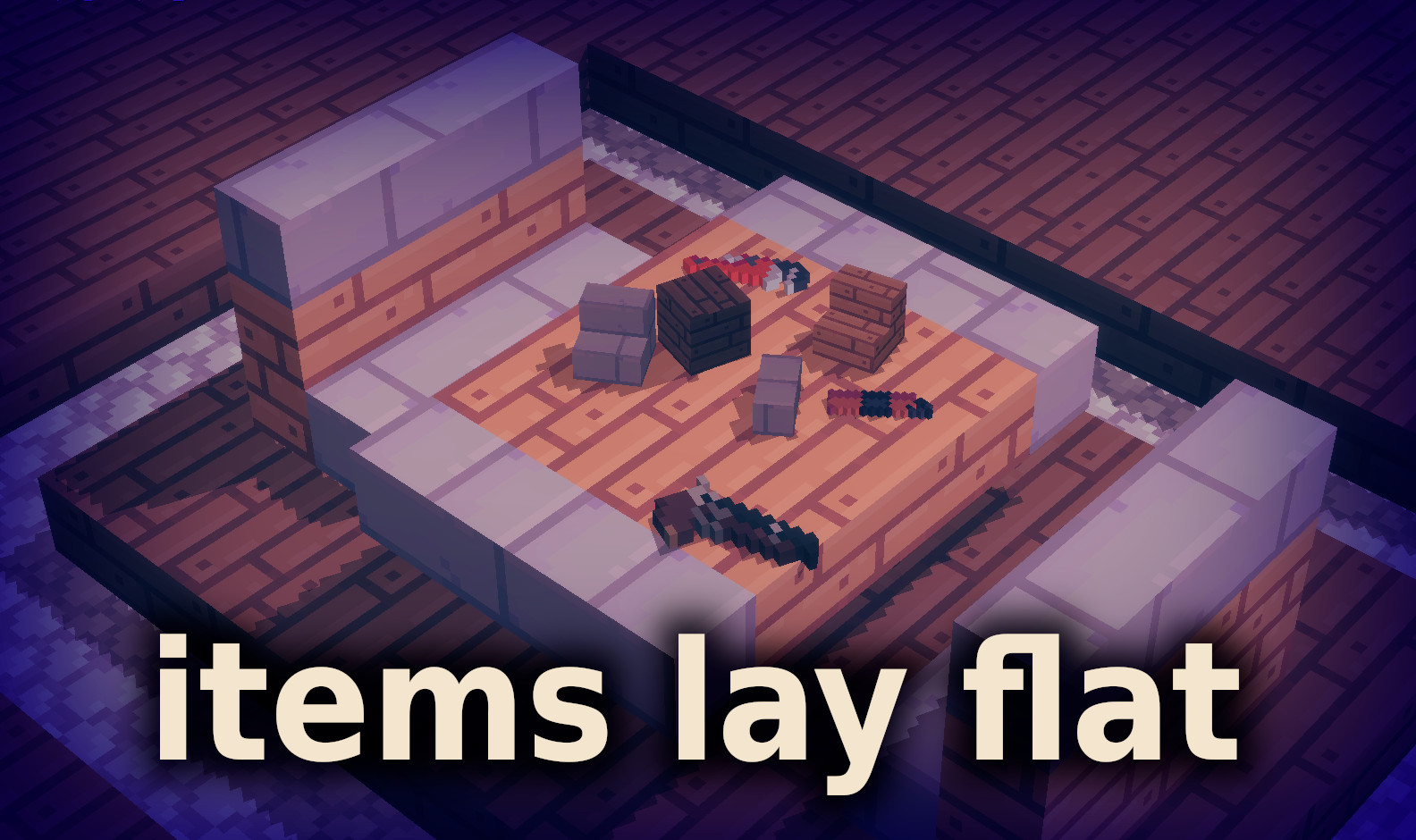Makes items not spin when they are on the floor. Tools and non-node items will lay flat, nodes will just stay in their default orientation. Items spinning is still implemented for nodes that are moving or falling.